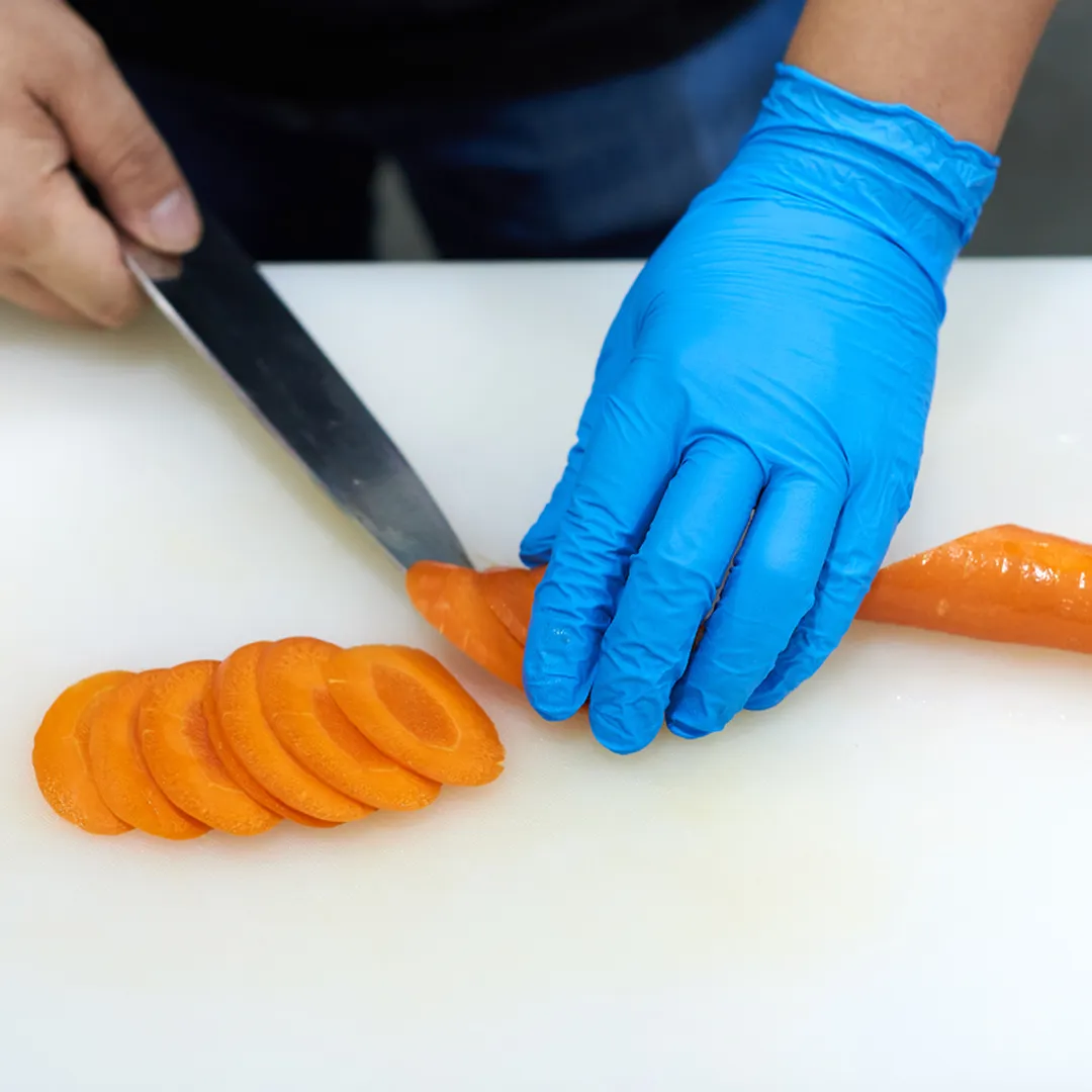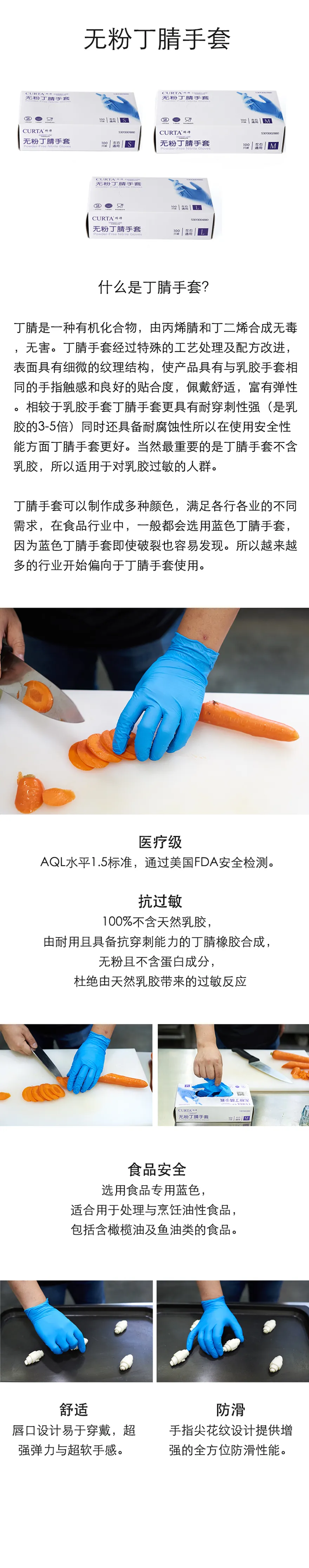 醫(yī)療級:AQL水平1.5標準,通過美國FDA安全檢測??惯^敏:100%不含天然乳膠,由耐用且具備抗穿刺能力的丁腈橡膠合成,無粉且不含蛋白成分,杜絕由天然乳膠帶來的過敏反應(yīng)。食品安全:選用食品專用藍色,適合用于處理與烹飪油性食品,包括含橄欖油及魚油類的食品。舒適:唇口設(shè)計易于穿戴,超強彈力與超軟手感。防滑:手指尖花紋設(shè)計提供增強的全方位防滑性能。無粉級:避免使用中粉末污染食品,更適合餐。