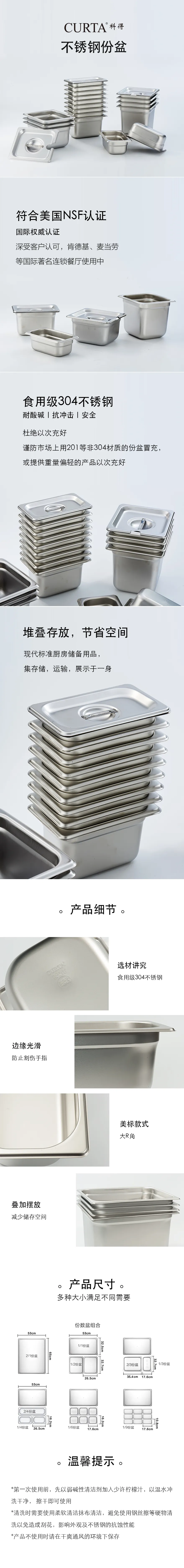 CURTA科得304份盆,美國NSF權(quán)威認證; 凸邊坎肩設(shè)計,方便收納疊放; 肯德基、麥當(dāng)勞等國際著名連鎖餐廳使用中; 謹防市場上用201等非304材質(zhì)的份盆冒充,或提供重量偏輕的產(chǎn)品以次充好。